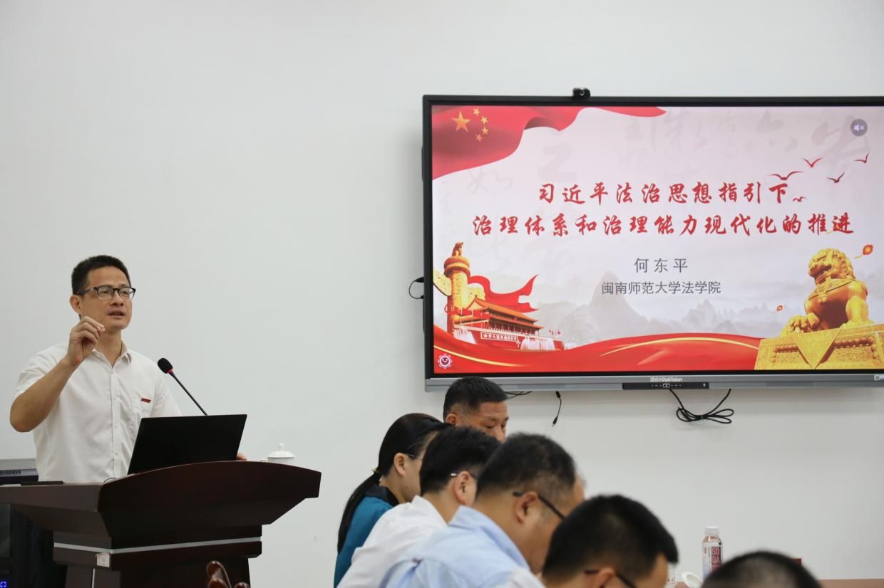 2022年7月19日,市法学会副会长、法治漳州研究中心主任何东平教授应邀南靖县委理论学习中心组(扩大)学习会邀请,并作题为《领导干部如何处理好法理与情理的关系》的讲座。